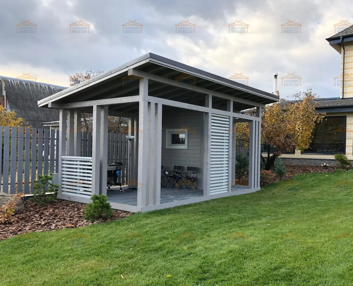 | Стойки (столбы навеса) | Массив бруса сечением 140×140 мм Примечание: возможно естественное растрескивание, которое никак не влияет на надежность. Во избежание этого необходимо использовать клееный брус |