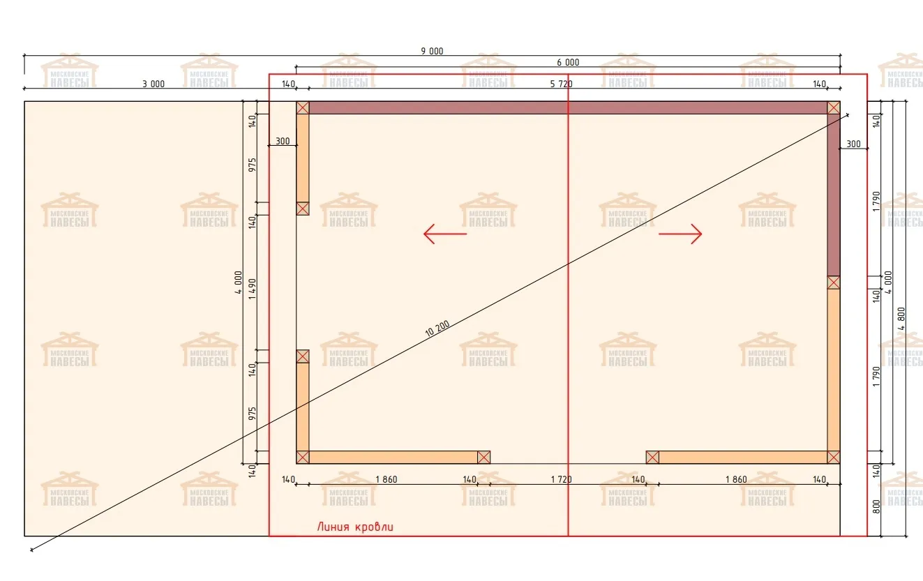 Размер: 4.8×9 м Площадь (по стойкам): 43 м² Срок производства: 45 день Срок монтажа: 5 дня