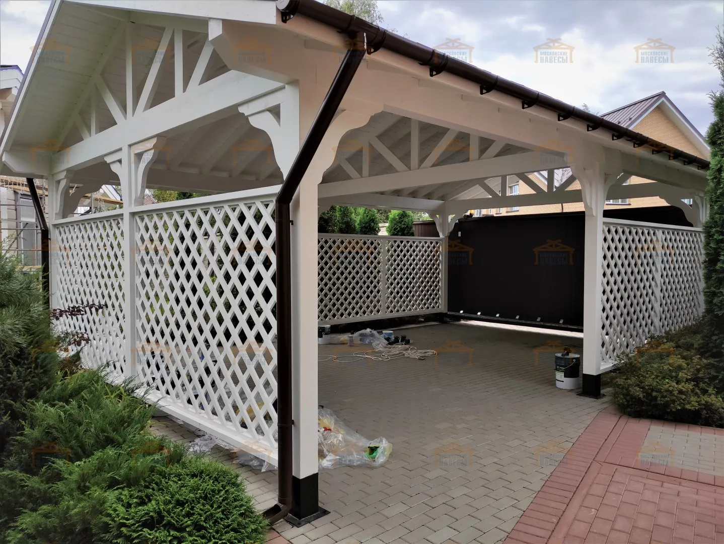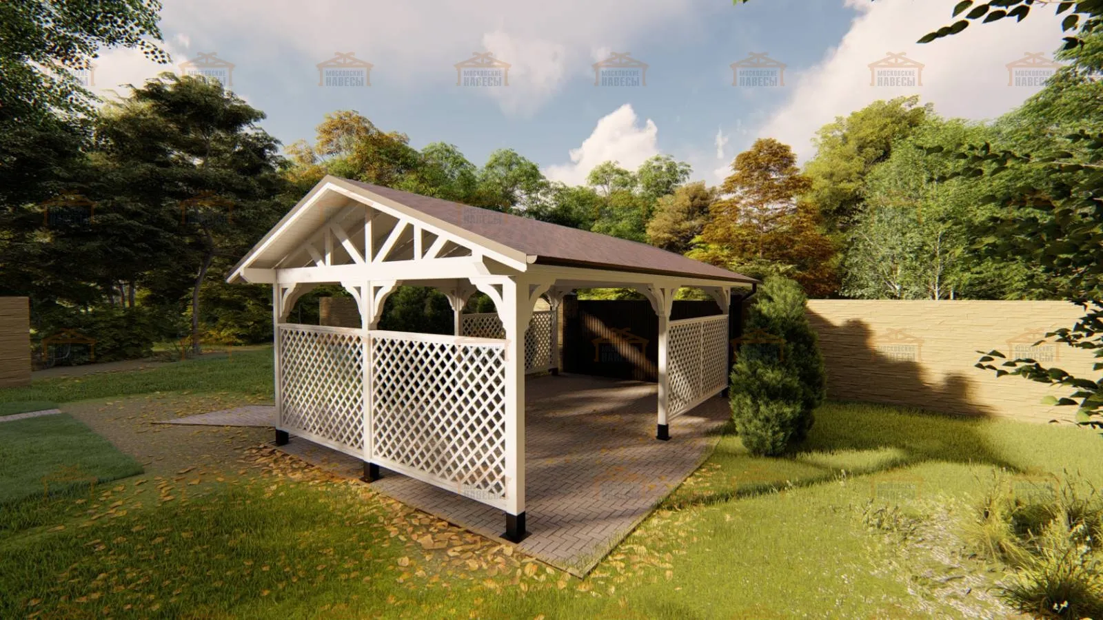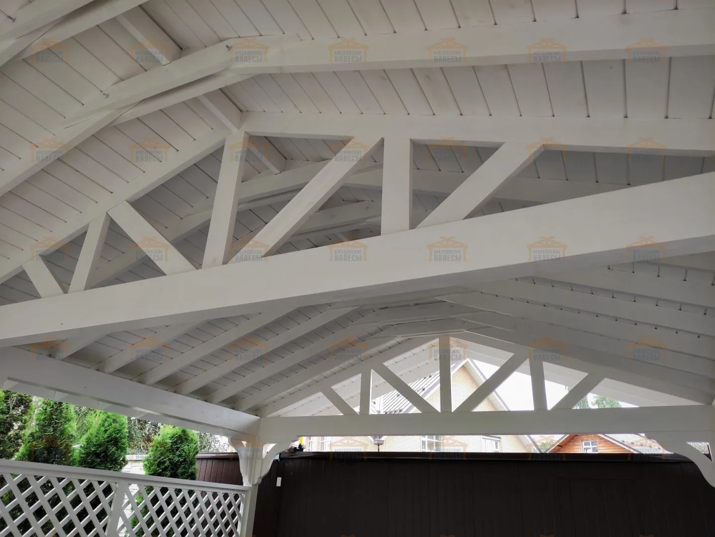 | Стойки (столбы навеса) | Массив бруса сечением 140×140 мм Примечание: возможно естественное растрескивание, которое никак не влияет на надежность. Во избежание этого необходимо использовать клееный брус | Массив бруса сечением 140×140 мм Примечание: возможно естественное растрескивание, которое никак не влияет на надежность. Во избежание этого необходимо использовать клееный брус | Клееный брус 140×140 мм |