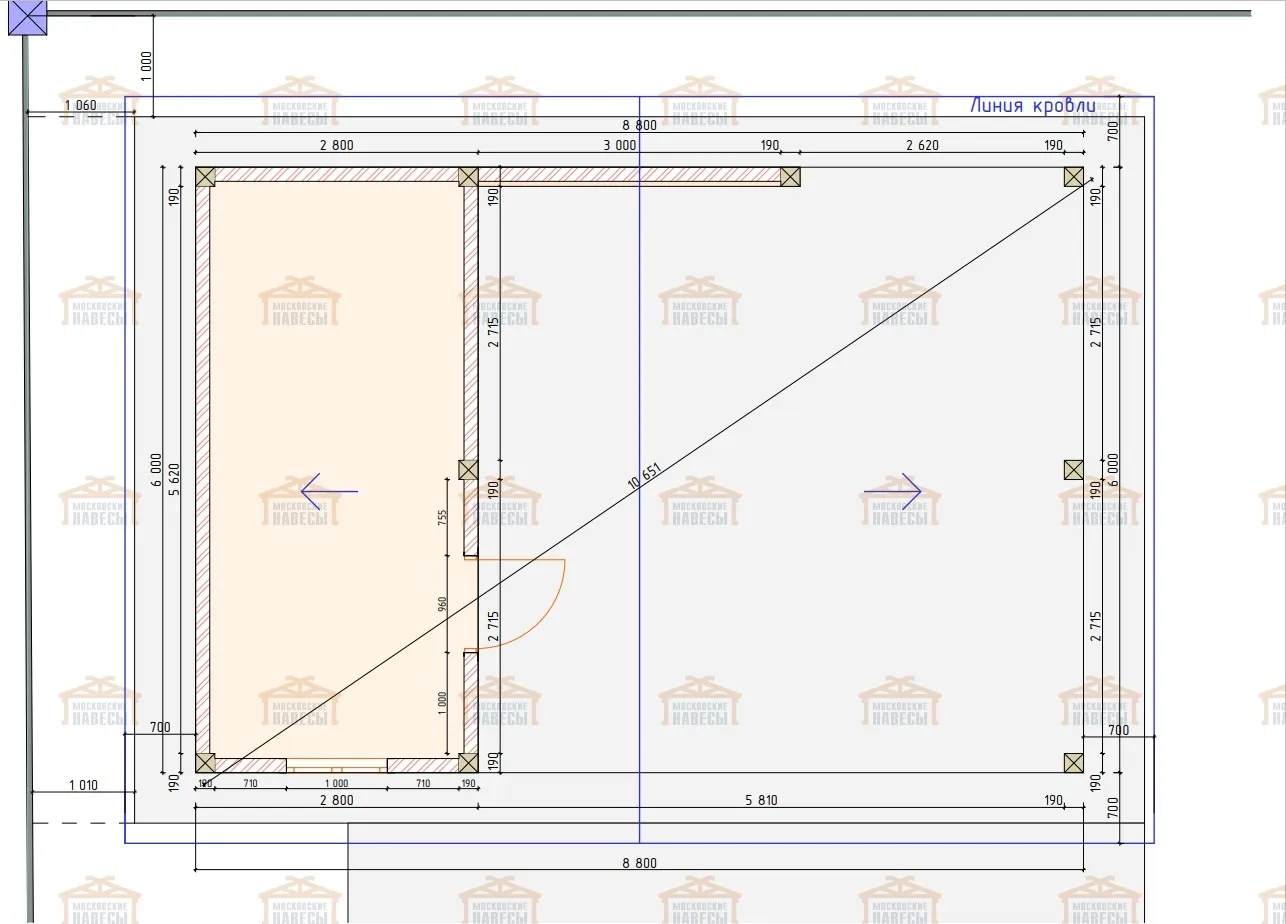 Размер: 8.8×6 м Площадь (по стойкам): 53 м² Срок производства: 55 день Срок монтажа: 10 дня