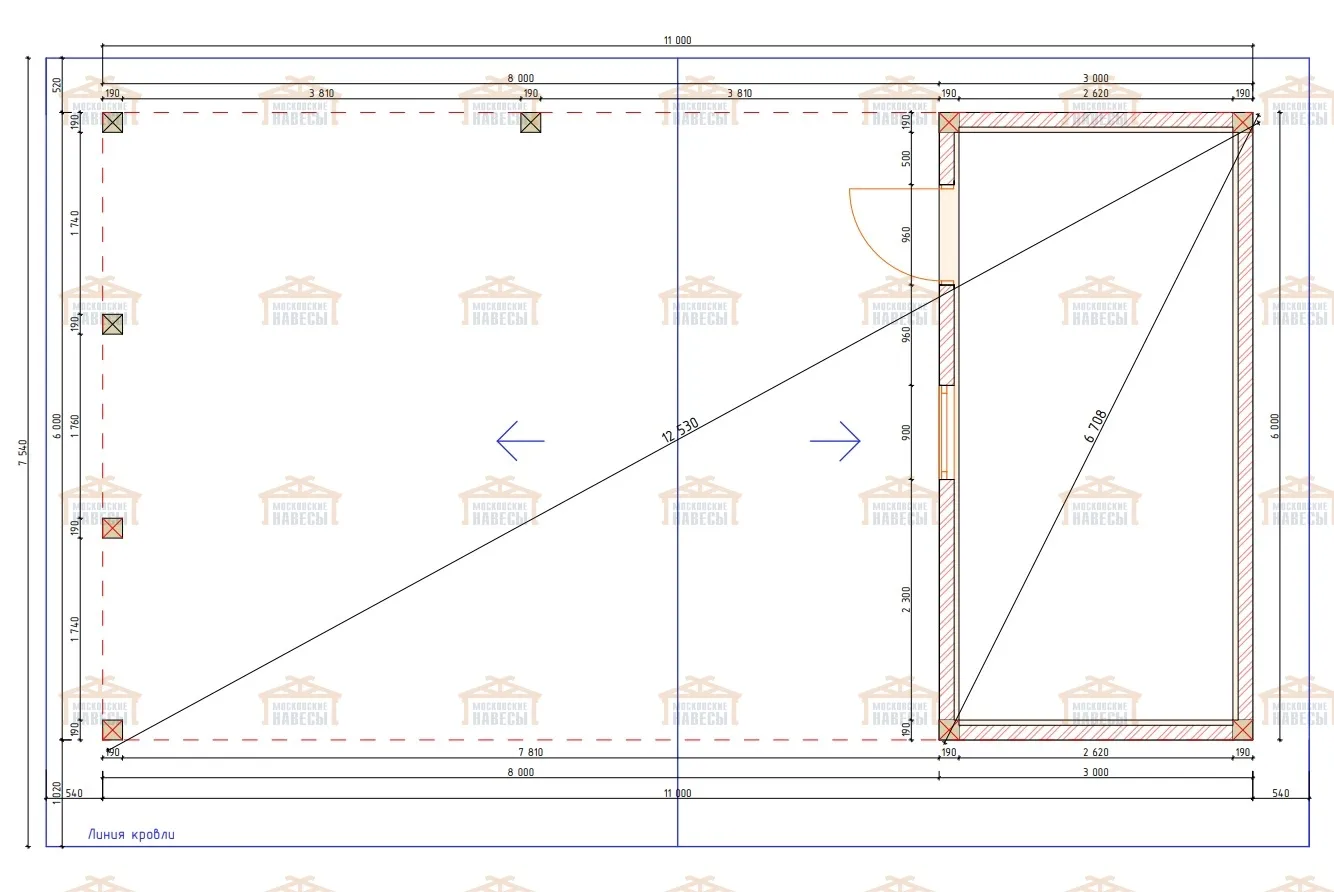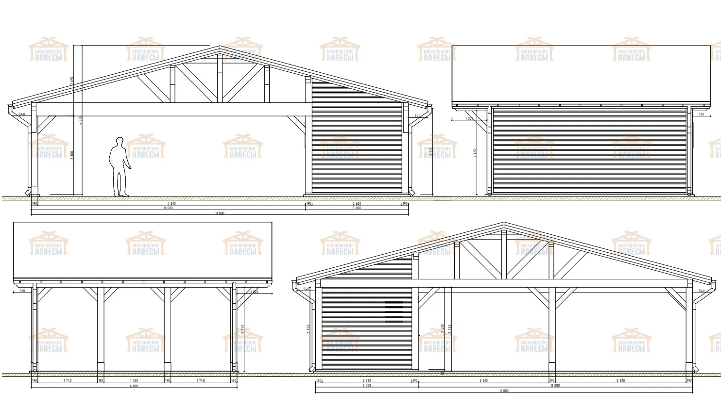 Размер: 11×6 м Площадь (по стойкам): 66 м² Срок производства: 65 день Срок монтажа: 15 дня