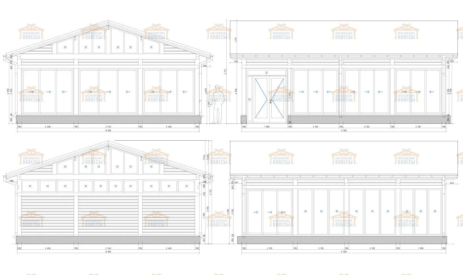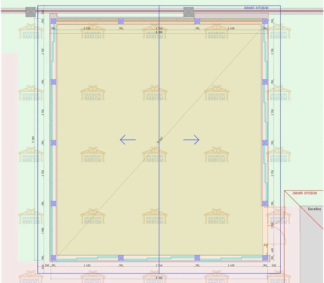 Размер: 8.3×9.3 м Площадь (по стойкам): 77 м² Срок производства: 55 день Срок монтажа: 14 дня